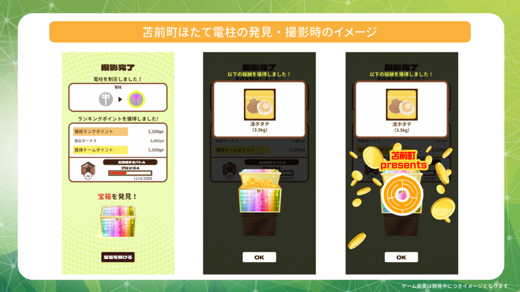 By photographing designated utility poles in Tomamae Town, you will randomly encounter the “Tomamae Scallop Utility Pole,” which grants freshly caught scallops directly from local fishermen, or the “Tomamae Badge Utility Pole,” which grants a can badge of Tomamae’s original character “Kumada Tomao.”
