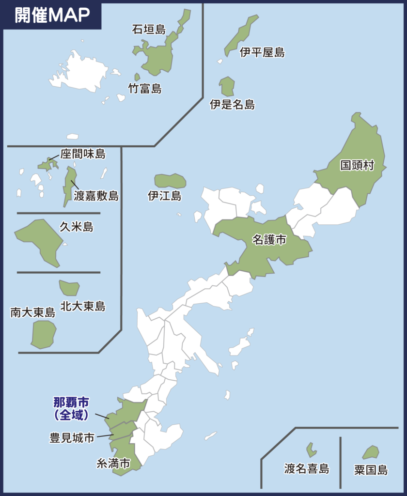 沖縄本島:糸満市、国頭村、豊見城市、名護市、那覇市