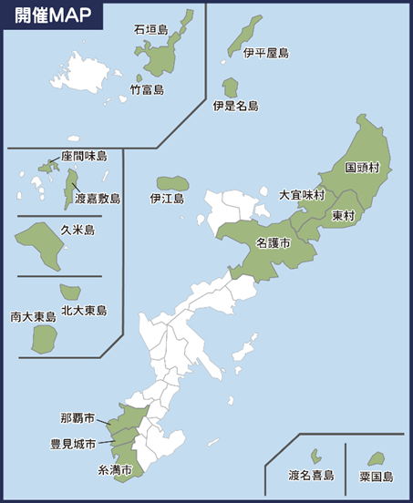 沖縄本島:糸満市、大宜味村、国頭村、豊見城市、名護市、那覇市、東村