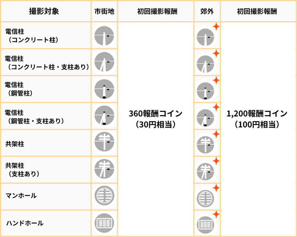 郊外の撮影対象はアセットアイコンや画像が通常のものと異なり、市街地の撮影対象より高額の報酬(1本あたり100円相当)が付与されます。
