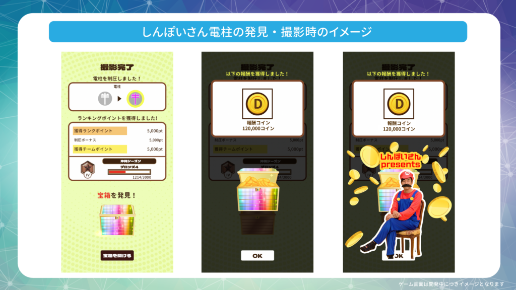 ①対象エリア内に「もずくチップス電柱」「しんぽいさん電柱」を設置。該当電柱を撮影すると、レインボー宝箱が出現し、その宝箱からそれぞれの賞品を獲得できます。