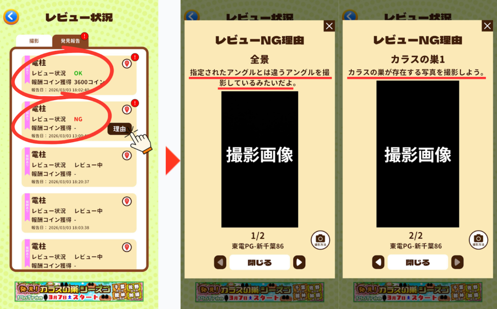 2026年3月7日(土)からの新シーズン「発見!カラスの巣シーズンin千葉」「発見!カラスの巣シーズンin栃木県佐野市・群馬県館林市・埼玉県加須市」では、カラスの巣がある電柱を発見して報告すると「カラスの巣発見報酬」が付与されます(運営によるチェックが行われます)。