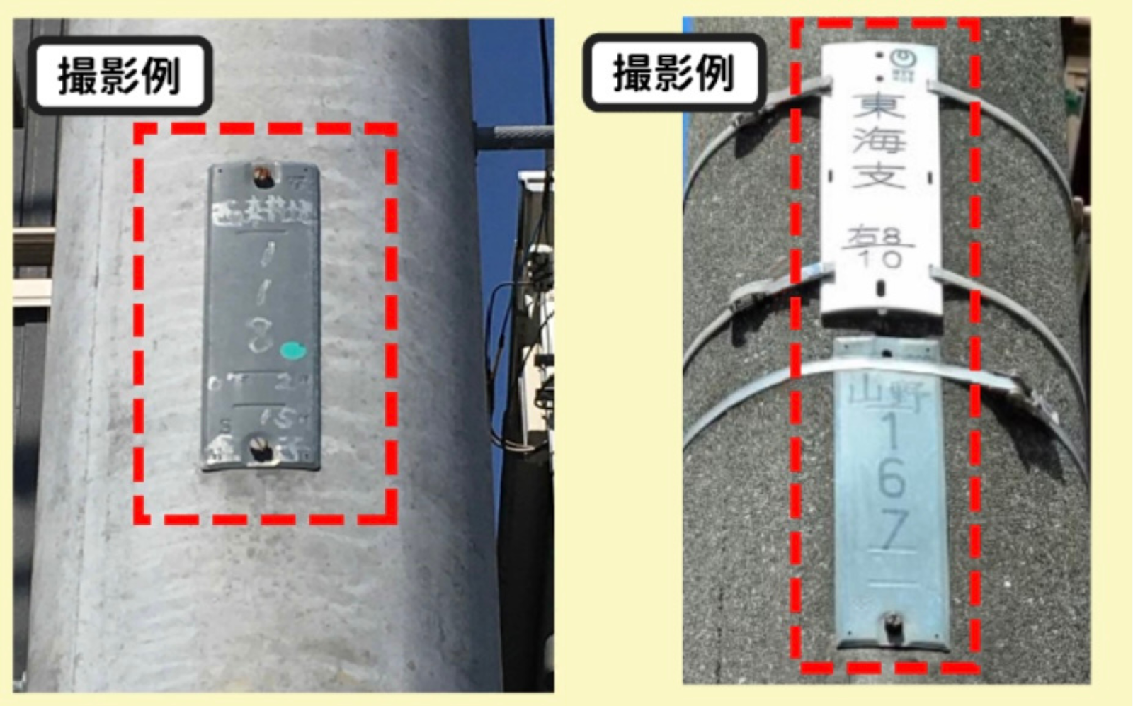 ・電柱番号:電柱番号がカメラいっぱいに写るように撮影してください。