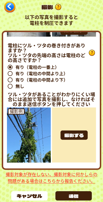 ※ツル・ツタの巻き付きがないのにツル・ツタ報告で「有り」を選択しないようにしてください(繰り返し誤った報告がなされた場合、アカウント停止の可能性がございます)。