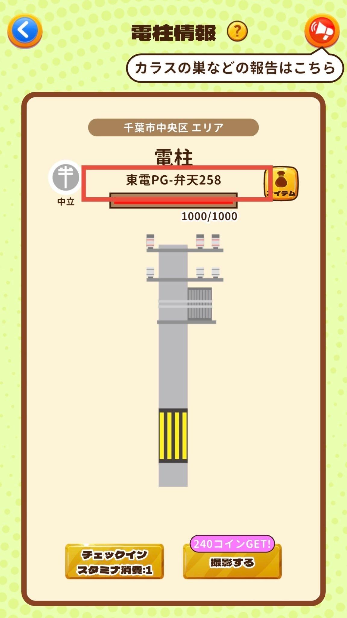 カラスの巣を報告する際は、実際に巣がある電柱の「電柱番号」と、ゲーム内の電柱情報ページに記載されている「電柱番号」が一致していることをご確認ください。